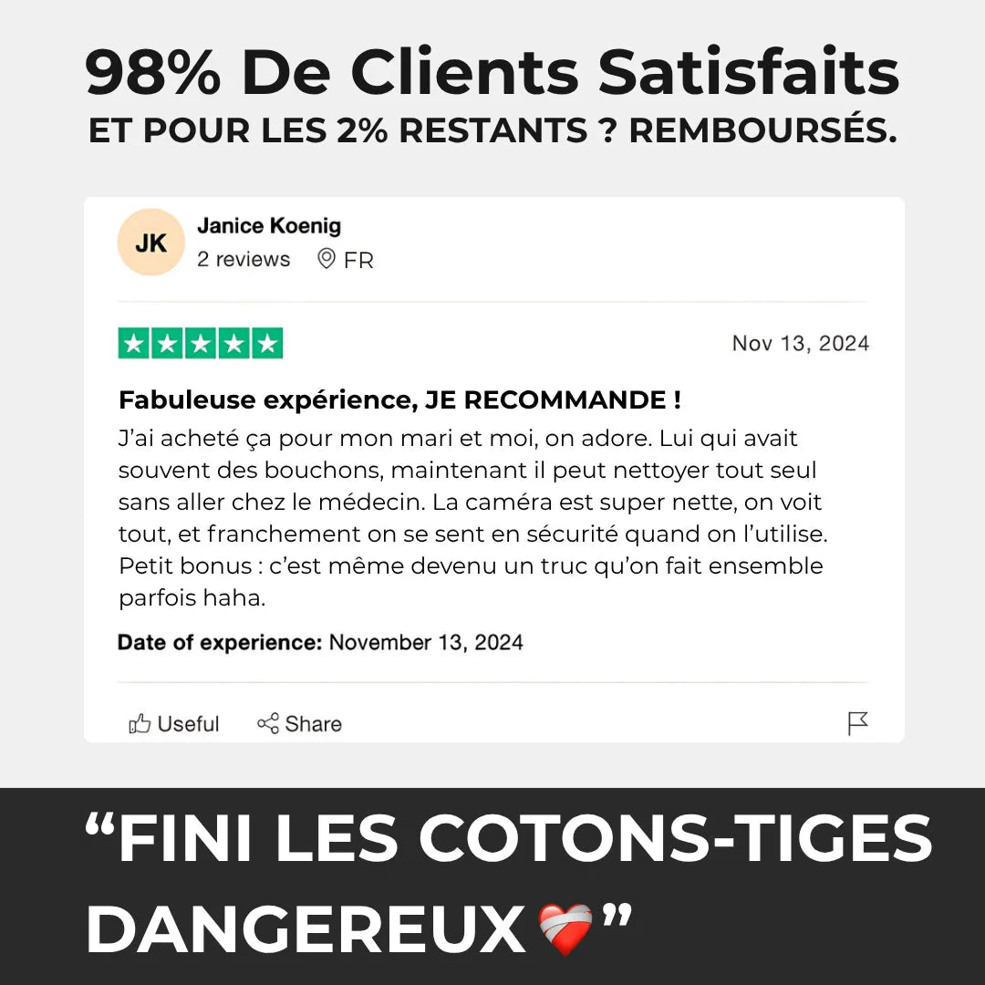 Le coton-tige pousse la cire PLUS LOIN dans l’oreille, ce qui crée des bouchons. Lumi-Ear nettoie en vision directe : c’est plus propre, plus sûr et plus efficace.